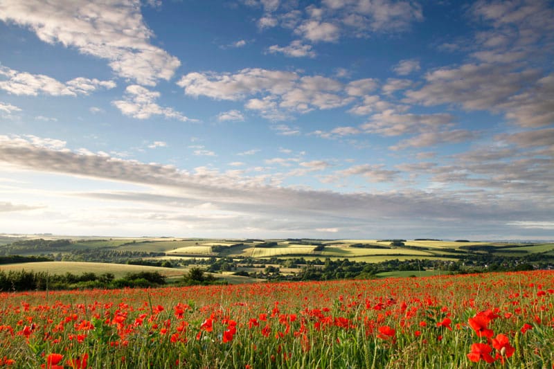 A field of wild poppies on the downs overlooking the Wylye Valley south of Hanging Langford, looking across the valley towards the soft greens of ripening wheat and barley fields on the southern edge of Salisbury Plain.