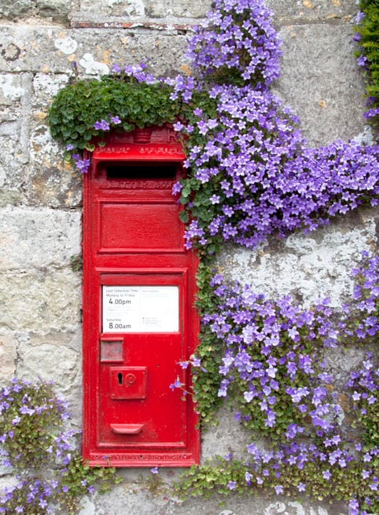 A Victorian post box set in a stone wall and surrounded by campanula flowers at Fifield Bavant in the Chalke Valley, Wiltshire.