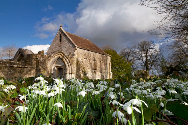 Snowdrops in the churchyard at St. Leonard’s Old Church in the village of Sutton Veny, near Warminster in Wiltshire.